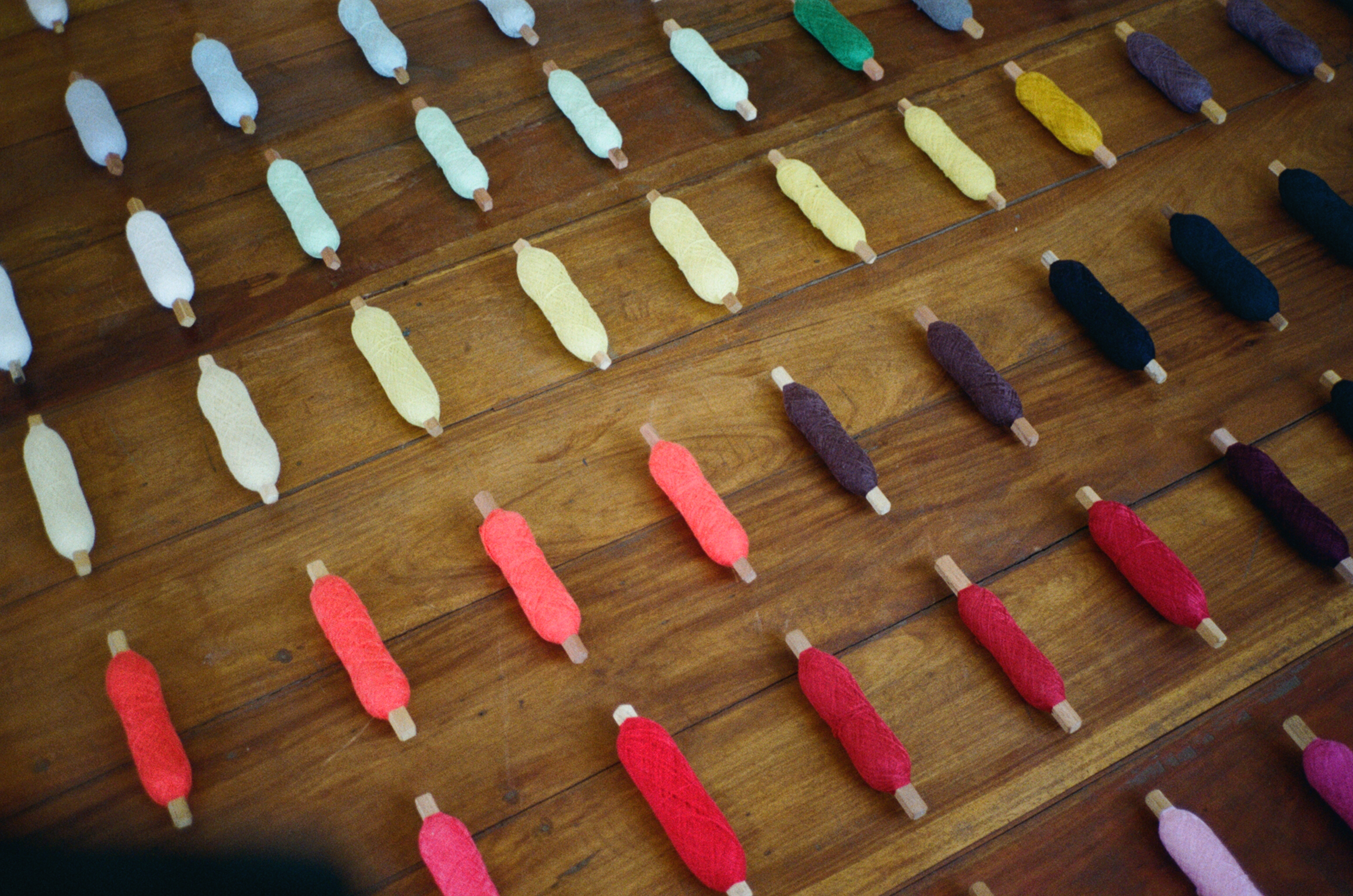 The thread that comes out of the garments is then wound back onto the wooden sticks. Each stick of yarn roughly represents one garment - a few larger garments were wrapped across two sticks.